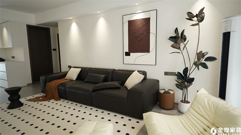 客厅主色调采用白色墙面与灰色大理石地砖搭配,创造出通透明亮的空间感。以低调的深色调沙发展现简约品味,通过一些精致的极简设计装饰画和空间摆件,为整个客厅注入一丝艺术氛围。