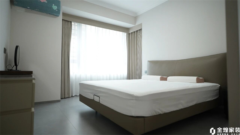 主卧采用了极简的设计语言,白色墙面搭配灰色地砖,配合大面积的落地窗,营造出宽敞明亮的空间感。简约风格的皮艺床,搭配质感柔和的床品,营造出宁静且优雅的休息氛围。
