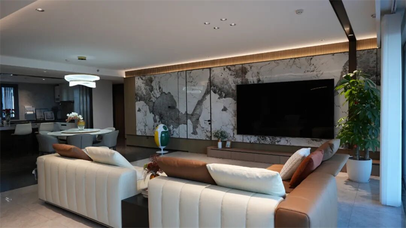 客厅,以开阔格局与精致细节彰显品质生活。大面积落地窗引入充足自然光,搭配通透纱帘,视野开阔,城市景观尽收眼底。电视背景墙采用天然大理石纹理饰面,结合木饰线条勾勒,层次丰富又不失高级感。