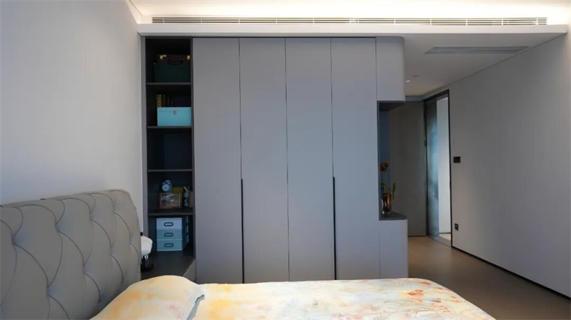 主卧整体色调沉稳柔和,灰色软包背景墙搭配木饰线条与隐藏式灯带,营造出静谧而高级的睡眠氛围。米色皮质大床配花卉图案床品,增添一抹自然柔美,让空间更具温度。一侧开放式衣柜与嵌入式收纳结合,满足衣物与饰品的分类存放需求,兼顾美观与实用性,打造一个整洁有序的私密空间。