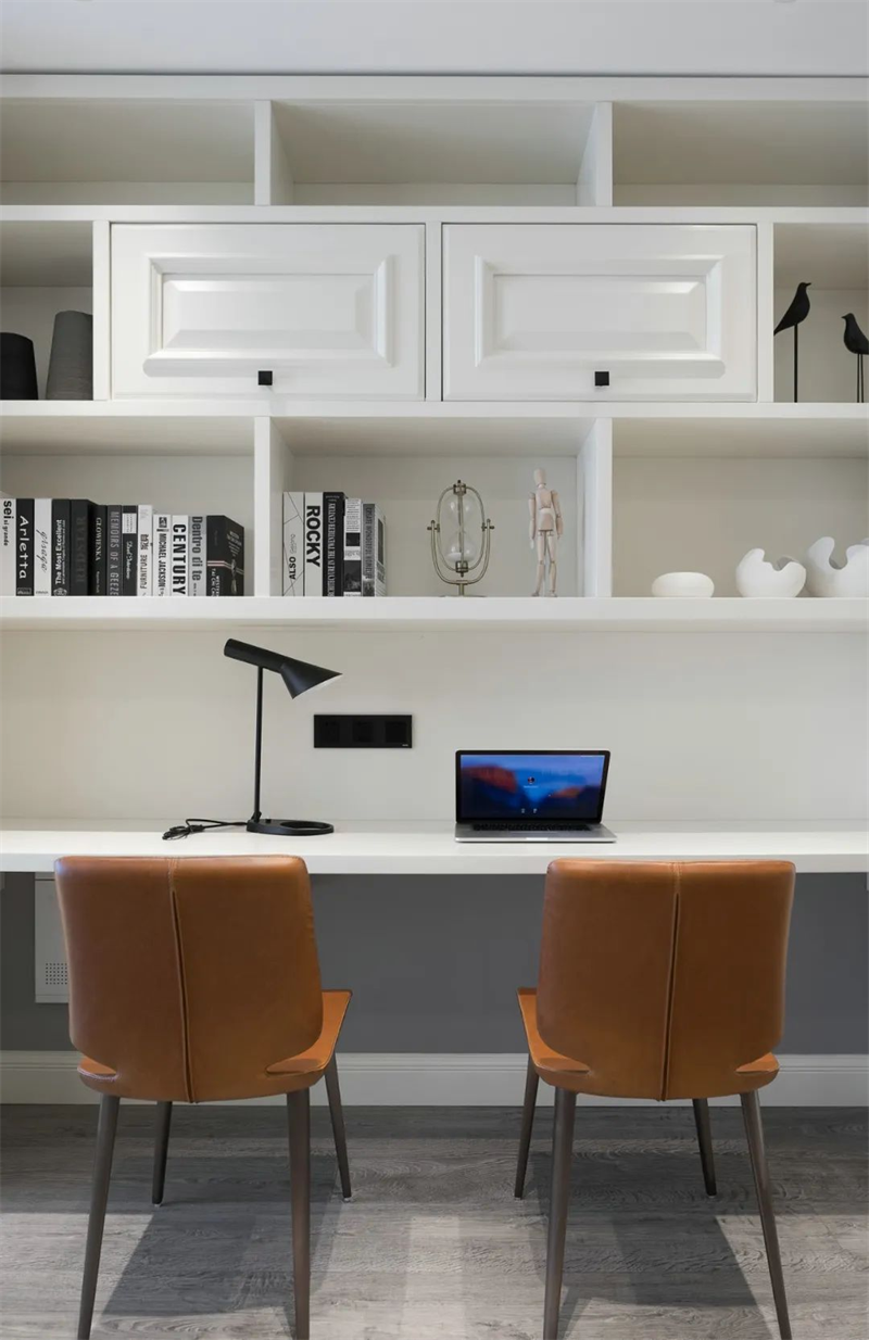 现代简约的书房注重实用性和整体协调性。纯白书桌和书架组合,打造出一个明快而整洁的学习空间。舒适的椅子、明亮的台灯以及一些简约的挂画与乐器装饰,让这个空间兼具工作与休闲的功能。