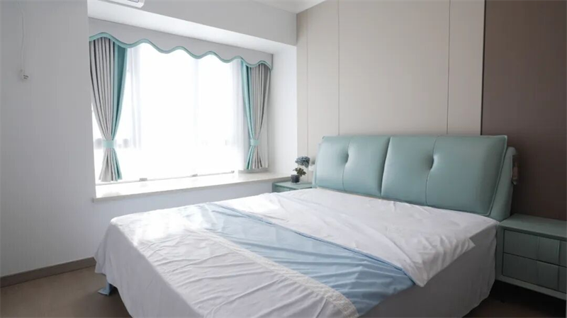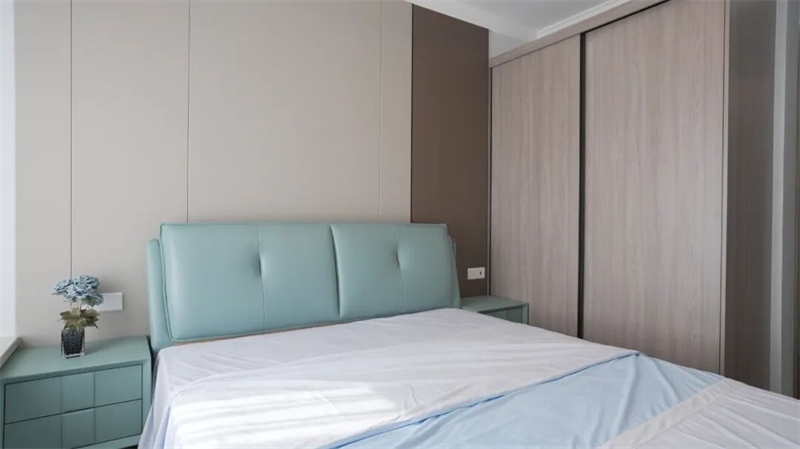 主卧以柔和的色调与简约的设计语言,打造一处静谧而治愈的休憩空间。浅灰蓝皮质床头搭配同色系床品,如晨雾般轻盈舒缓,营造出宁静安逸的睡眠氛围。背景墙采用拼色设计,米白与深棕交织,层次分明却不失整体感,赋予空间低调的质感与温度。两侧对称的床头柜延续色彩呼应,细节处点缀小花艺,增添生活气息。